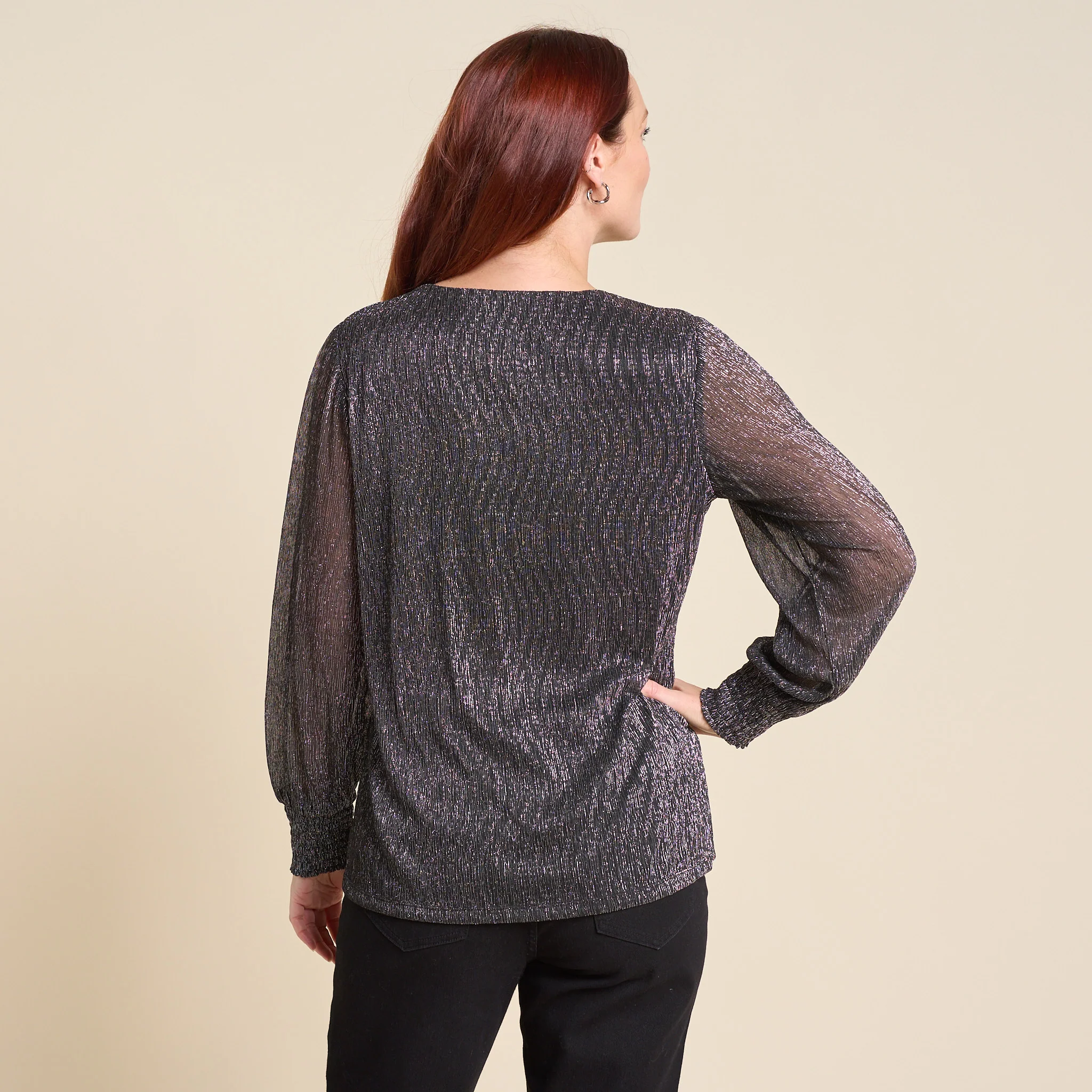 Shine bright this season in our Bodre V Neck Shirred Sleeve Blouse—crafted from shimmering bodre fabric that catches the light with every move. The delicate smocked sleeve detail adds a festive touch, making it the perfect piece for holiday gatherings and special nights out.