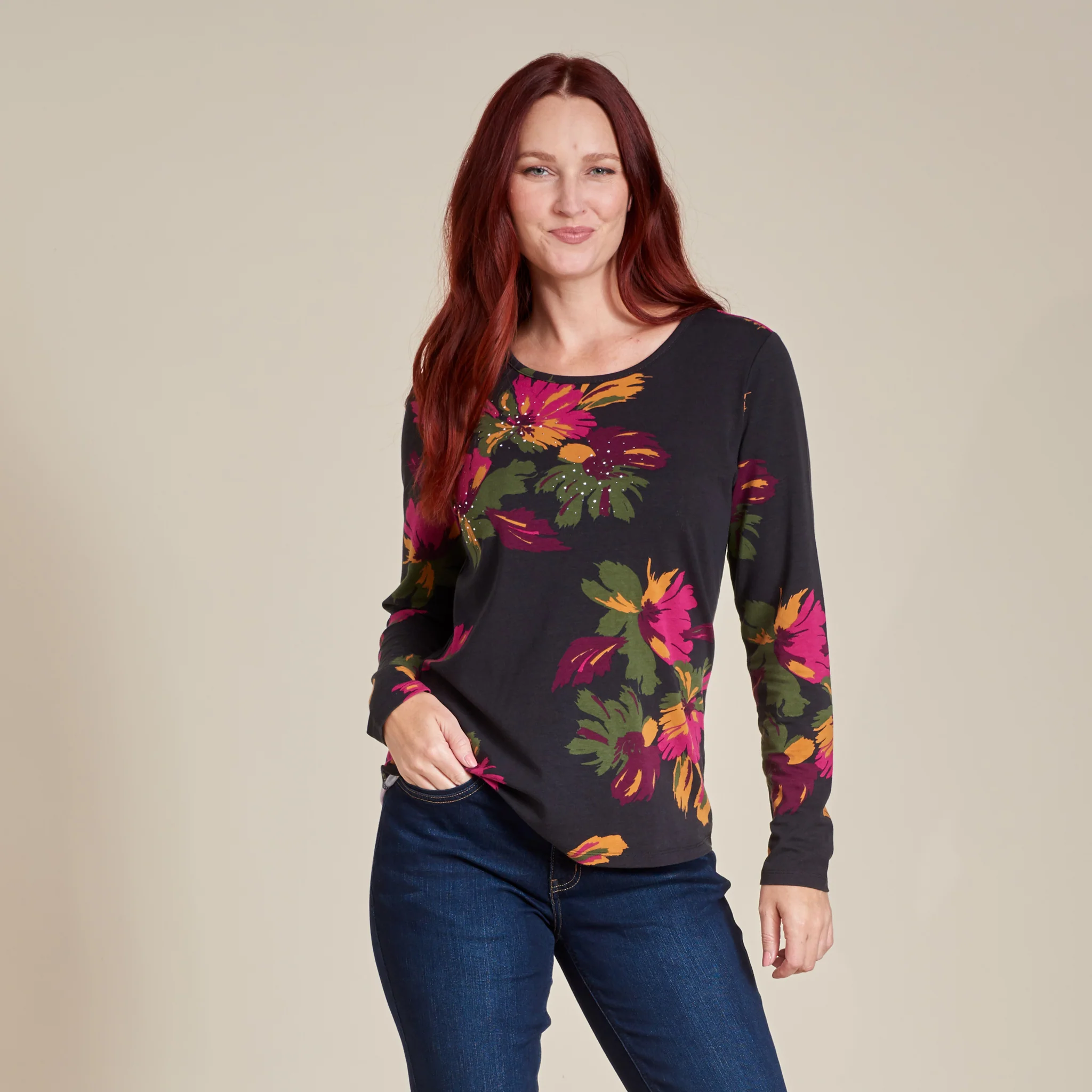 Add a touch of sparkle to your everyday style with our Floral Print Embellished Long Sleeve Tee, featuring an exclusive print and delicately placed rhinestud detailing. Crafted from a soft brushed knit, it's as cozy as it is eye-catching.