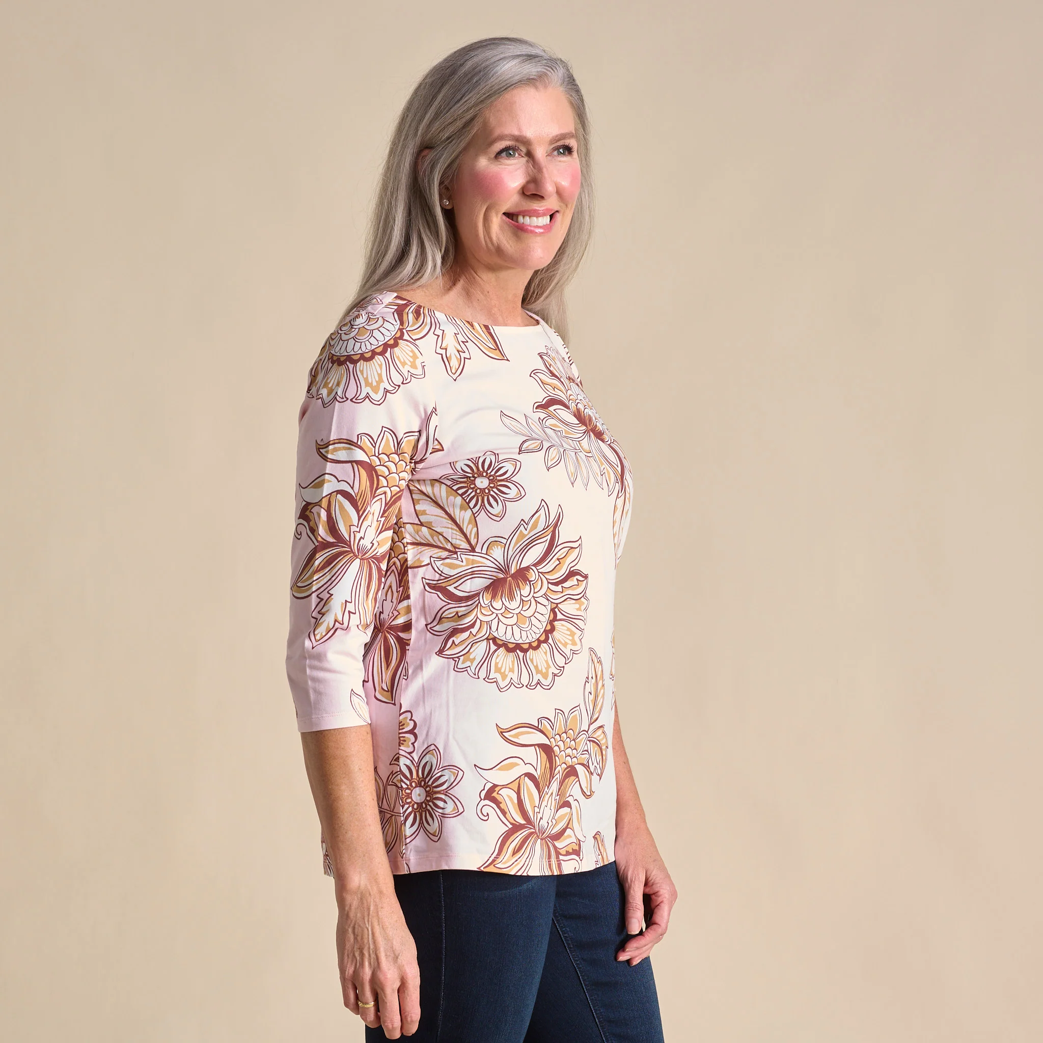 Brighten your day with our exclusive C&B floral boatneck tee, crafted from super-soft fabric for all-day comfort. Its easy 3/4 sleeves and versatile silhouette make layering simple and elevate your look with effortless charm.
