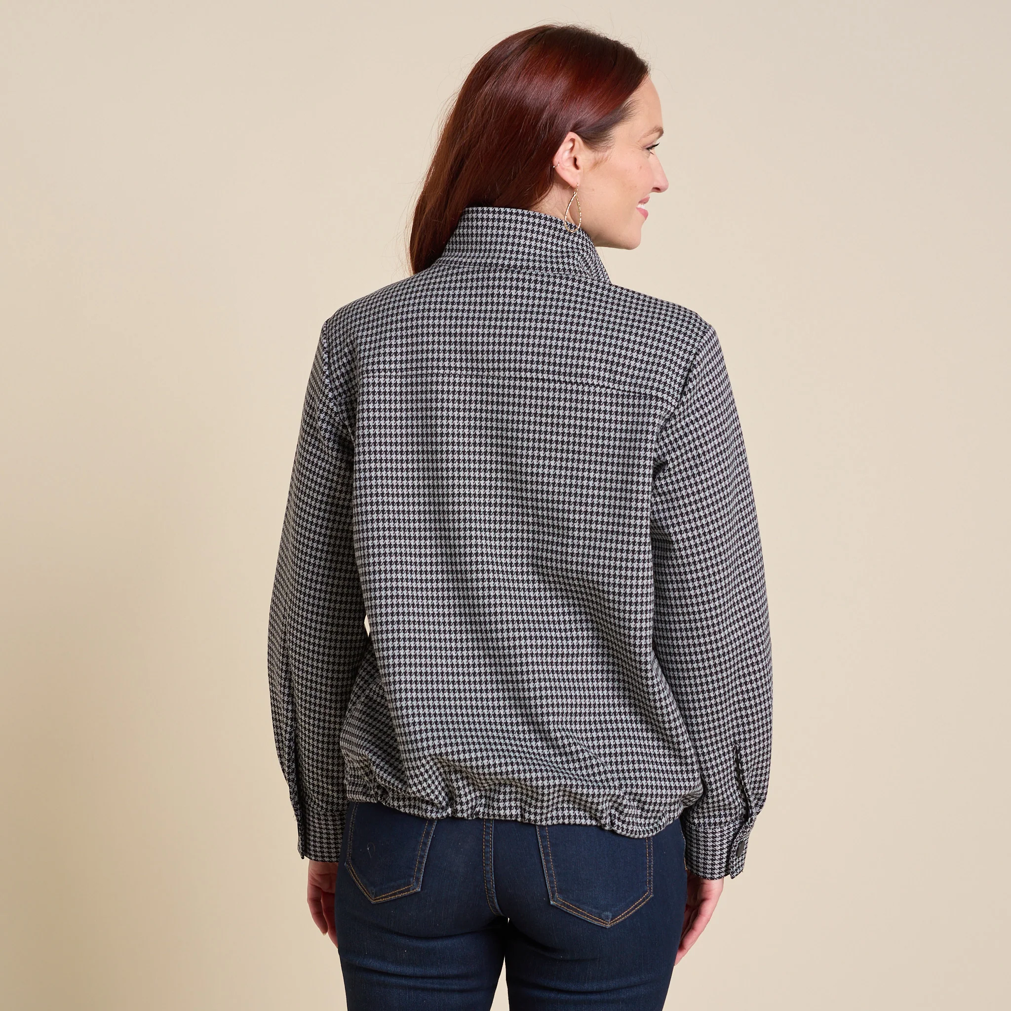 Elevate your look with our on-trend Houndstooth Printed Jacket—crafted with a zip and snap front plus adjustable bungees for the perfect fit. Sharp enough to dress up, effortless enough to wear down, it's your go-to layer for instant style and confidence.