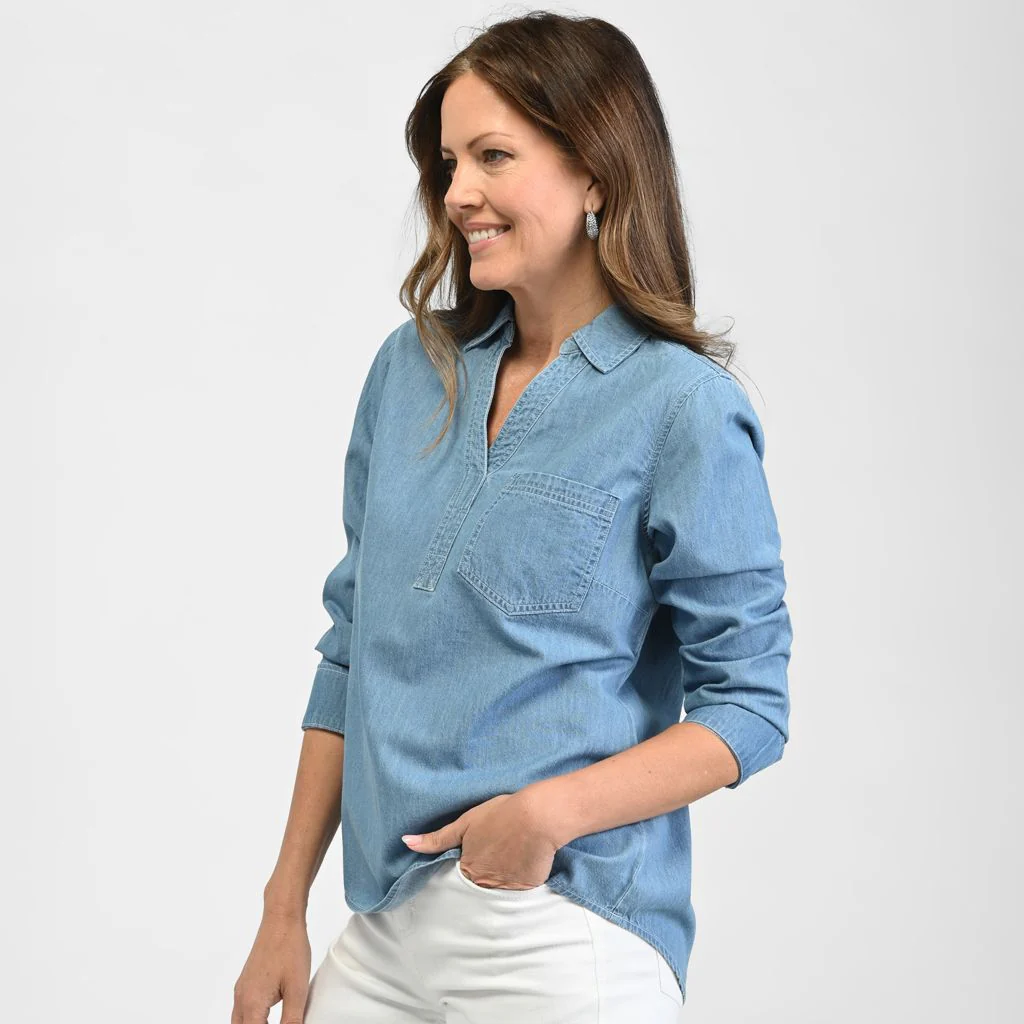 Embrace effortless spring style with our Long Sleeve Henley Neck Tunic, crafted from 100% cotton chambray for a light, denim-inspired look. With its unique crossover Y neckline and contrast stitching, itās your go-to layering piece for easy, stylish outfitting all season long.