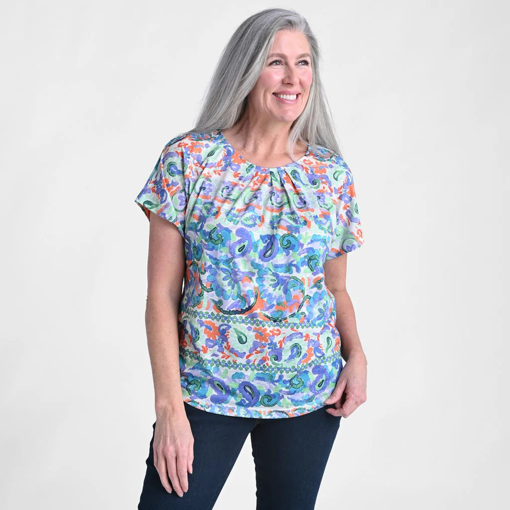 Elevate your everyday look with our Paisley Stripe Print Short Sleeve Tee, crafted from slub fabrication and featuring dolman-style sleeves for a relaxed fit, and a modest scoop neck with shirring detail for added flair. Available in three stunning colors, this exclusive C&B print is the perfect blend of comfort and style for any casual occasion.