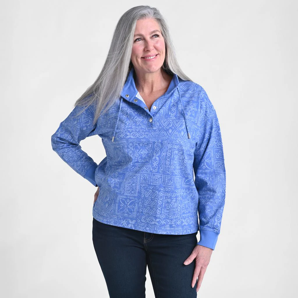 Stay cozy and chic with our Patchwork Print Mock Neck Sweatshirt, featuring a relaxed silhouette, stylish mock neck, and eye-catching snaps with metal drawstring ends. Made from lightweight French Terry, this versatile piece is perfect for layering across seasons and comes in three exclusive tonal C&B prints for a unique, elevated touch.