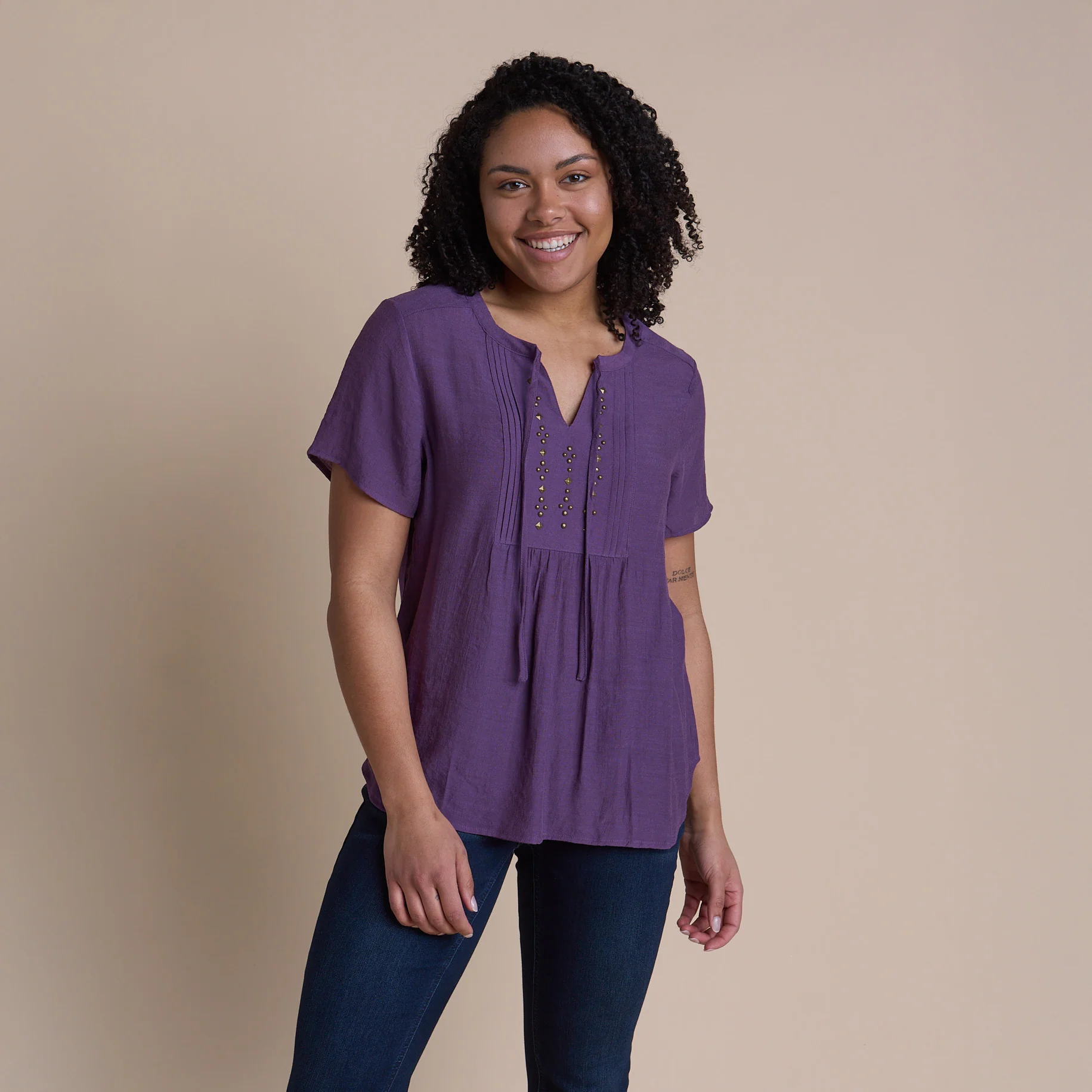 Our studded tie-neck blouse drapes beautifully in a lightweight woven fabric that feels effortlessly polished. Finished with chic stud and tassel details, it's the perfect piece to dress up with trousers or keep casual with your favorite denim.