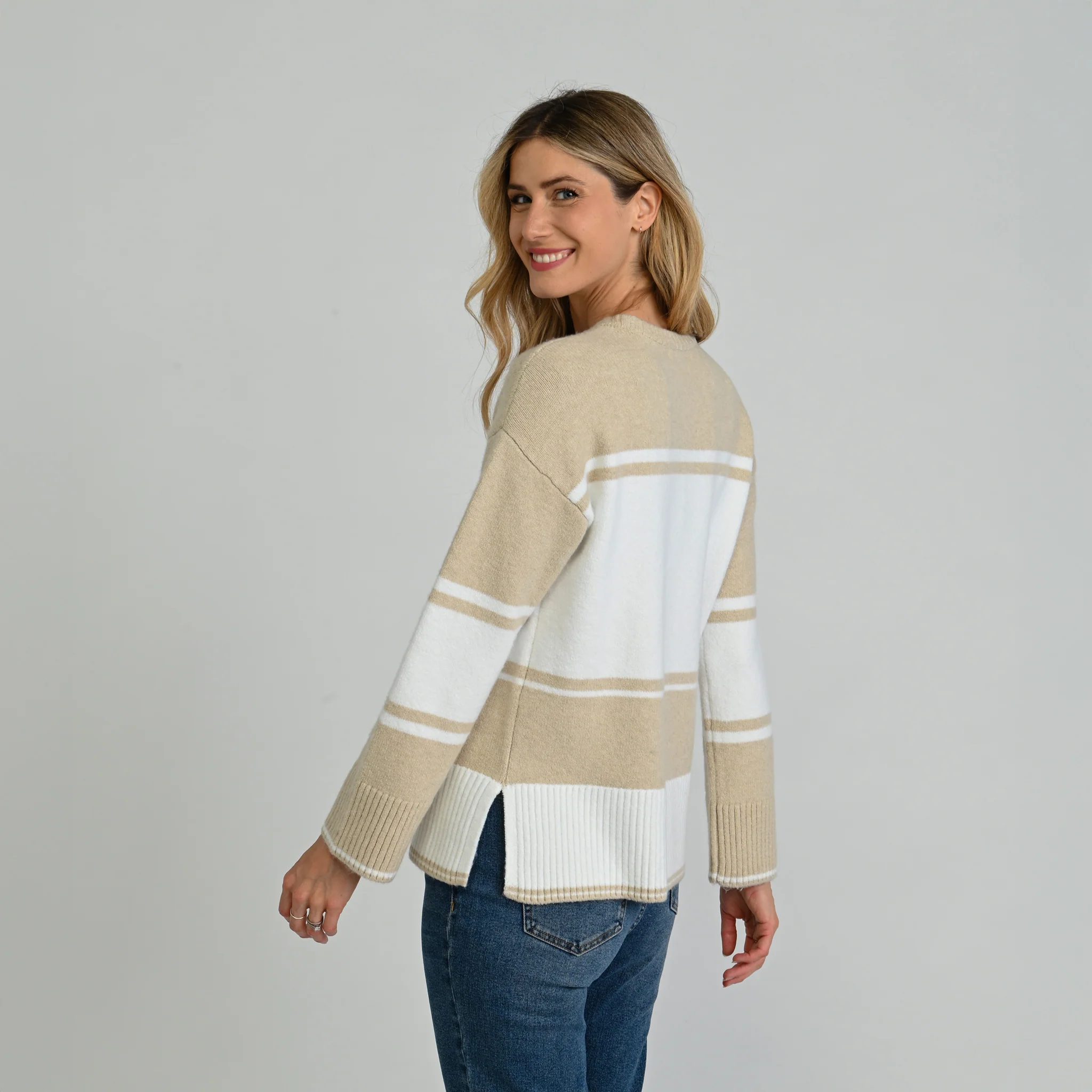 Wrap yourself in effortless comfort with our super-soft Stripe Crew Neck Sweater, designed to keep you cozy all season long. Thoughtful details like slit sides and a thick ribbed neckline make it as functional as it is timelessly chic.